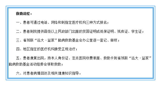 本着“救助一个人,受益一家人”的公益宗旨,由山东省残疾人福利基金会主办,济南远大中医脑康医院承办,联合山东电视台综艺频道共同打造远大脑康益家工程。活动期间,主办单位将为精神疾病患者提供基金救助,具体如下: